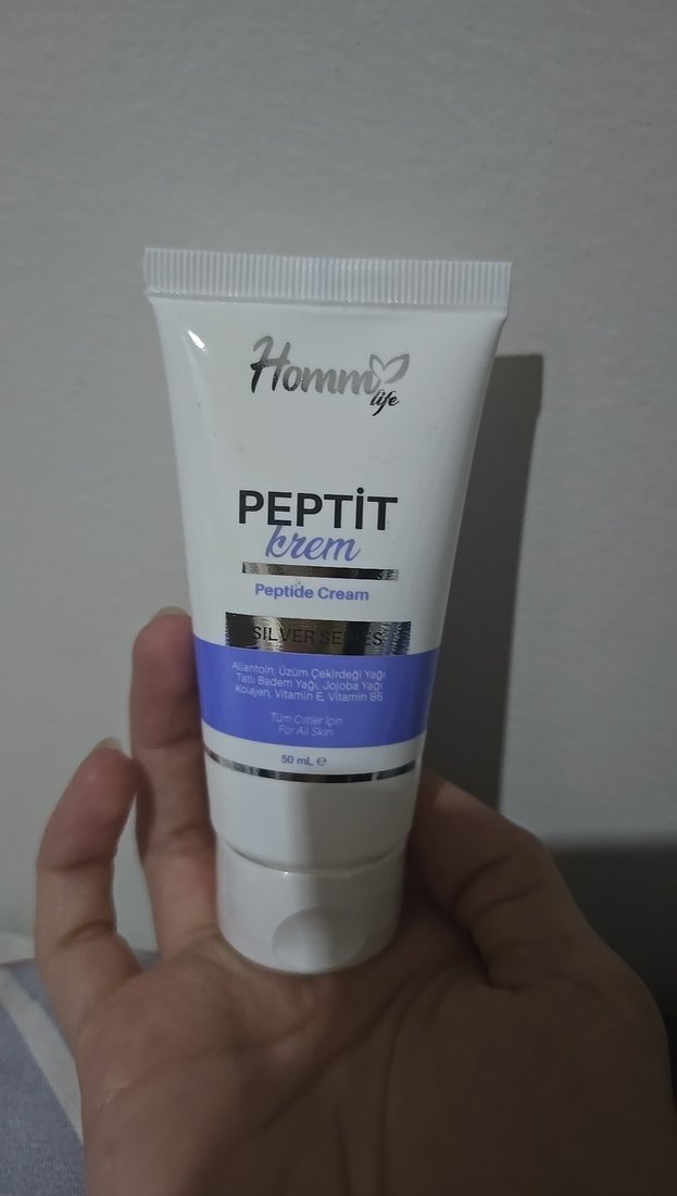 Homm Life Peptit Peptit Krem, üzüm çekirdeği yağı, jojoba yağı ve E ile B5 vitaminleri içerir. Tüm cilt tipleri için uygundur, 50 ml tüpte.
