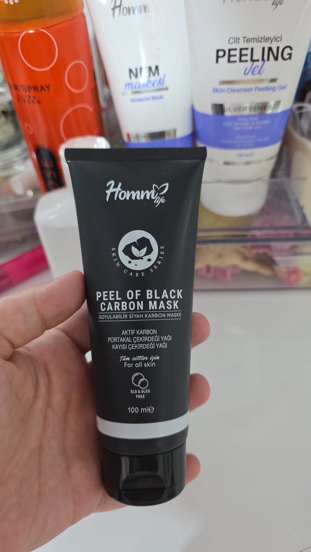 Homm Life Siyah Karbon Peeling Maskesi, aktif karbon, portakal çekirdeği ve kayısı çekirdeği yağı içerir. Tüm cilt tipleri için uygundur, SLS ve SLES içermez. 100 ml.