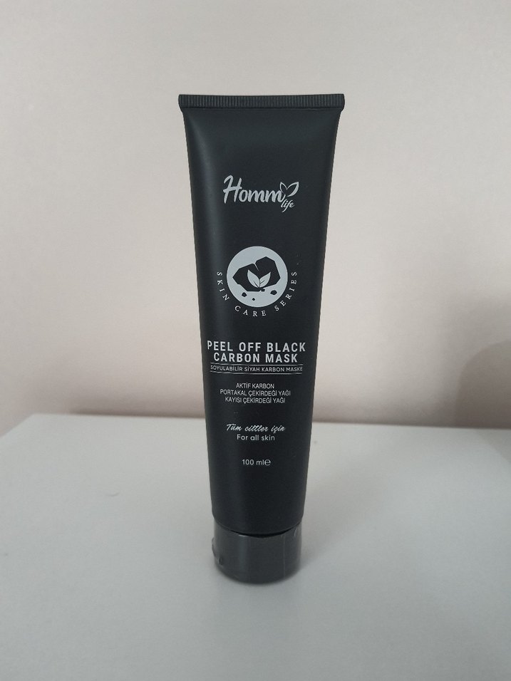 Homm Life siyah karbon soyulabilir maske, tüm cilt tipleri için uygun, 100 ml tüpte sunulmaktadır.