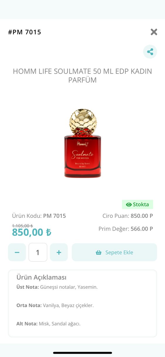 HOMM Life Soulmate 50 ml kadın parfümü, güneş ve yasemin üst notalarıyla ferah ve çiçeksi bir koku sunar.