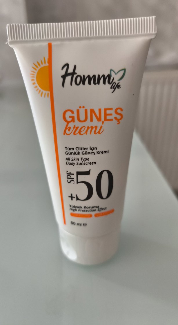 Homm Life SPF 50 güneş kremi, tüm cilt tipleri için yüksek koruma sağlar. 50 ml'lik pratik ambalajda günlük kullanım için uygundur. ☀️