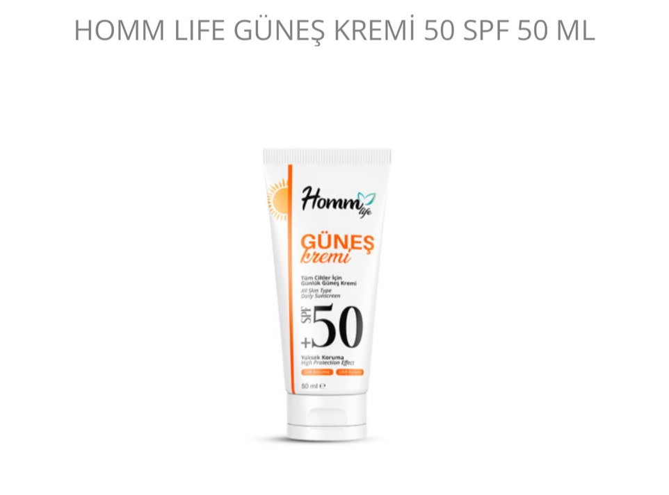 Homm Life güneş kremi, SPF 50 ile yüksek koruma sağlar ve tüm cilt tipleri için uygundur. 50 ml tüpte günlük güneş koruması sunar. ☀️