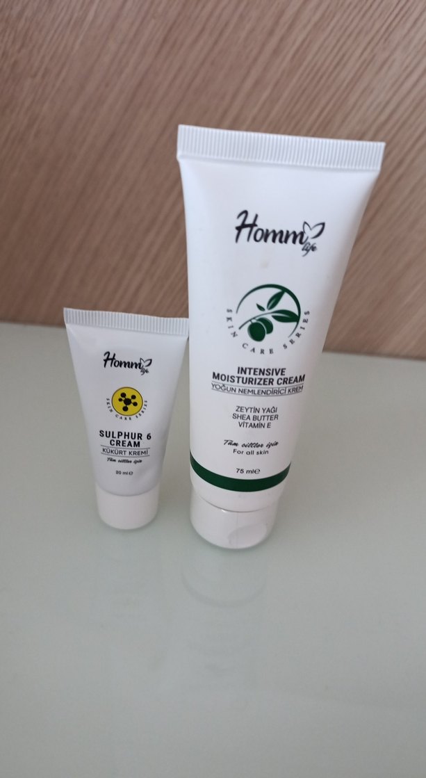 Homm Life Zeytin Yağı, Shea Butter ve Vitamin E içeren Yoğun Nemlendirici Krem ve nazik formüllü Kükürtlü Krem içerir.