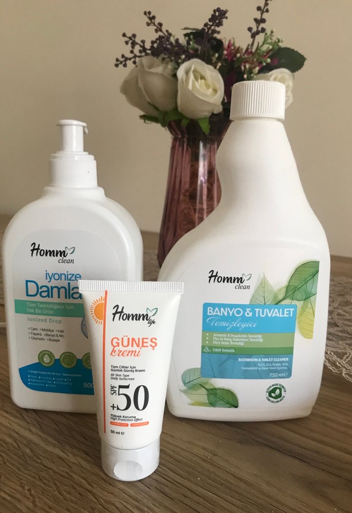 Homm Clean Güneş Kremi SPF 50 yüksek koruma sağlar. Set, iyonize damla ve banyo-tuvalet temizleyici içerir.