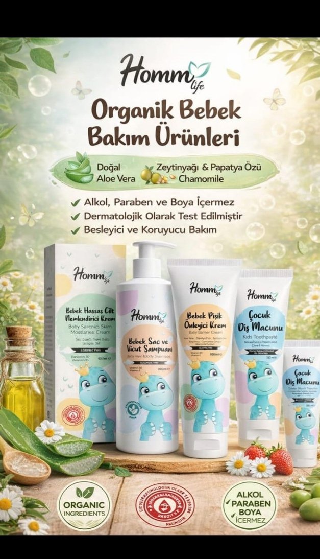 Homm organik bebek bakım ürünleri, doğal zeytinyağı, papatya ve aloe vera özleri içerir. Alkol, paraben ve boya içermez, dermatolojik olarak test edilmiştir. 4 parca kutu icerigi