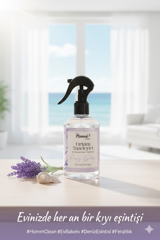 Homm ortam tazeleyici, kıyı esintisi kokusuyla evinize ferah bir hava getirir. 250 ml sprey şişede kolay kullanım sağlar.