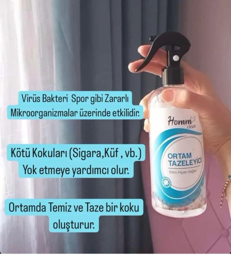 Homm ortam tazeleyici sprey, virüs ve bakteri gibi zararlı mikroorganizmaları yok eder, sigara ve küf gibi kötü kokuları giderir, ortamda temiz ve taze bir koku oluşturur.