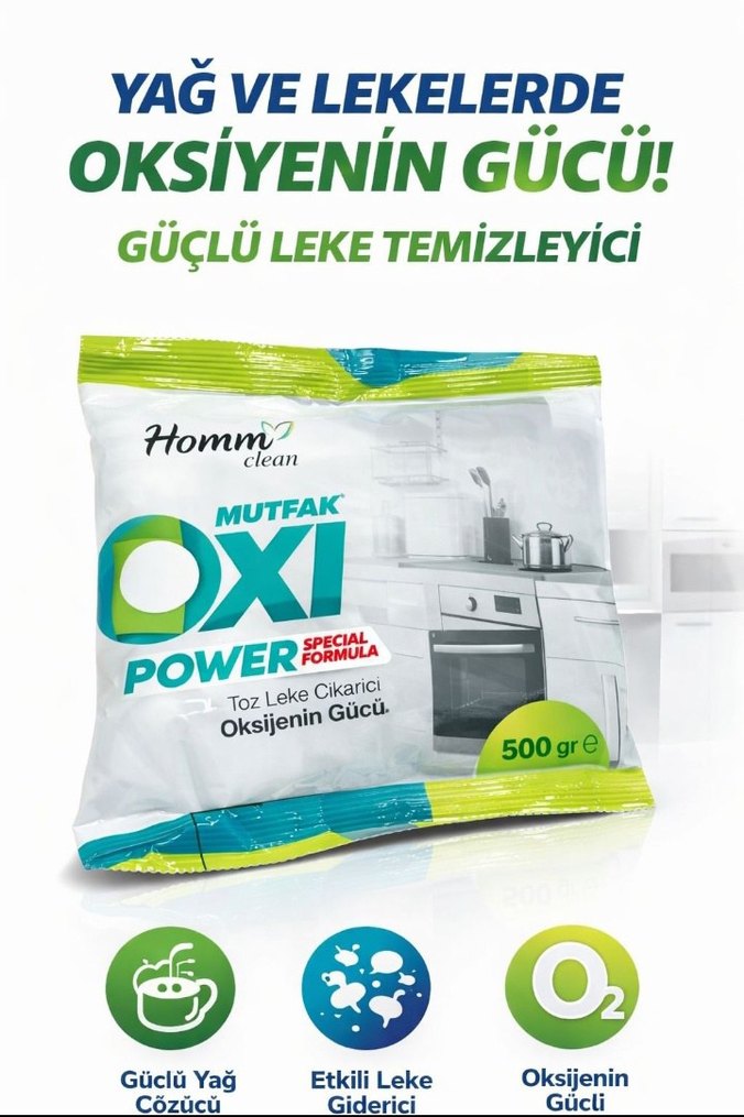 Homm Oxi toz, mutfakta yağ ve lekeleri oksijen gücüyle etkili şekilde çıkarır. 500g paketle güçlü temizlik sağlar.