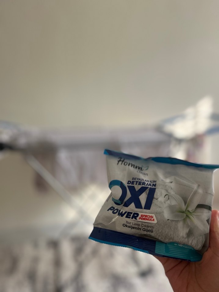 Homm Oxi Power beyaz toz deterjan, oksijenli formülü ile güçlü leke çıkarma sağlar.