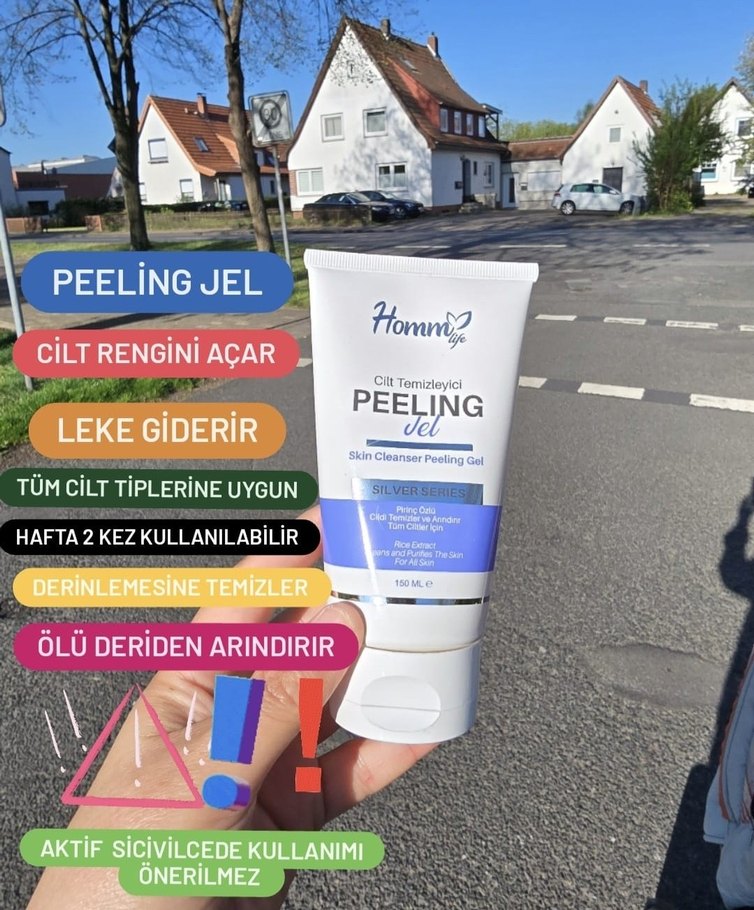 Homm Peeling Jel, cildi temizler, cilt rengini açar ve lekeleri giderir. Tüm cilt tiplerine uygun olup iki kez kullanılabilir. Aktif sivilcelerde önerilmez. ✨