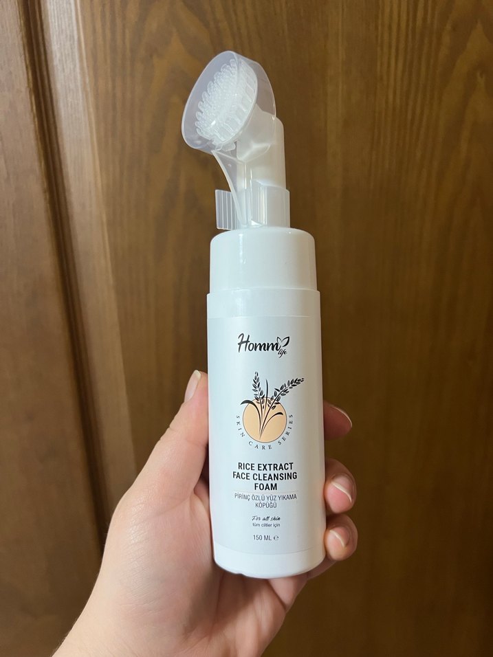 Hommlife pirinç özlü yüz temizleme köpüğü, dahili fırçasıyla cildi nazikçe temizler. 150 ml şişede sunulur.