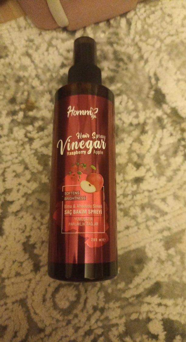 Homm elma ve ahududu özlü saç bakım spreyi, saçı yumuşatır ve parlaklık kazandırır. 200 ml şişede sunulur.