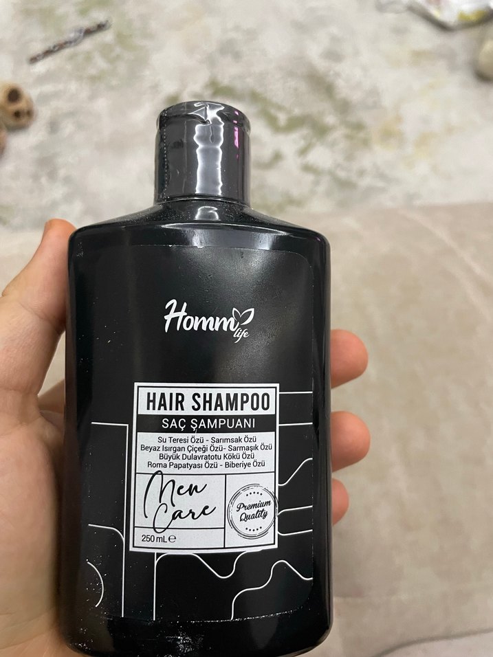 Homna saç şampuanı 250 ml siyah şişede, ısırgan otu, beyaz ısırgan çiçeği, oğulotu kökü, nar çekirdeği yağı ve zeytinyağı içerir.