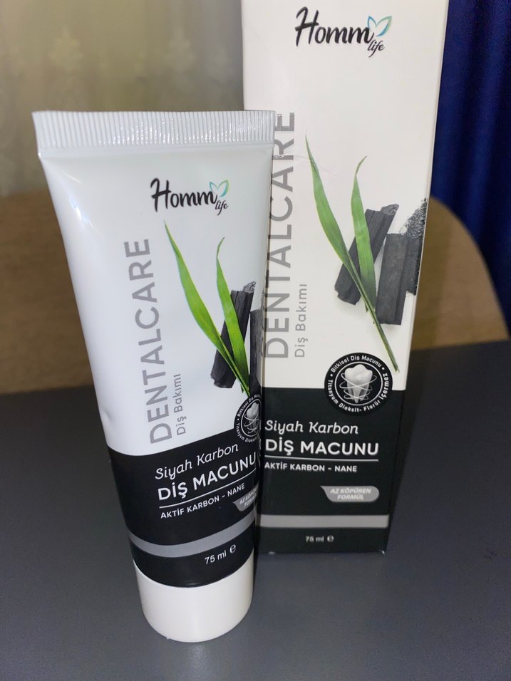 Homm siyah karbonlu diş macunu, aktif karbon ve nane içerir. Diş bakımı sağlar, ferahlatıcı etkisi vardır. 75 ml tüp şeklindedir.