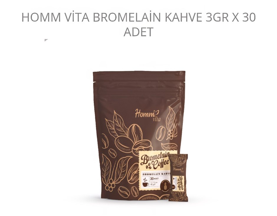 Homm Vita Bromelain Kahve, 30 adet paket içerisinde sunulmaktadır. Koyu kahverengi toz formdadır ve kullanımı kolaydır. ☕bölgesel incelme icin tercih edilmektedir