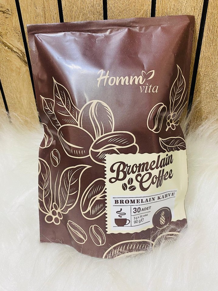 Homm Vita Bromelain Kahve, 30 adet 90 gramlık poşetlerde sunulur. Koyu kahverengi toz, kolay demleme için uygundur. ☕