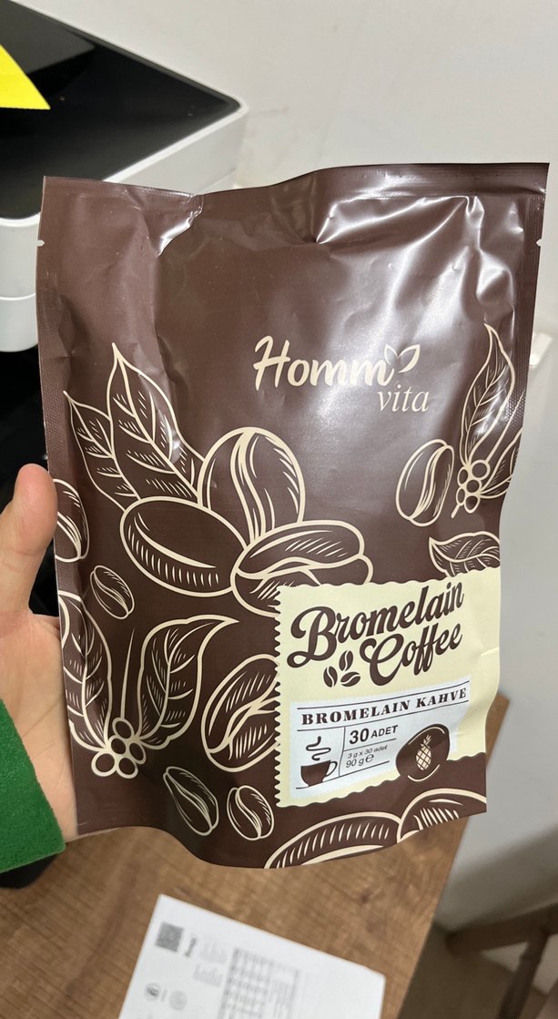 Homm Vita Bromelain Kahve, 30 adet porsiyonluk paket içinde, koyu kahverengi toz halinde sunulmaktadır. Kahve ve bromelain karışımıdır. ☕
