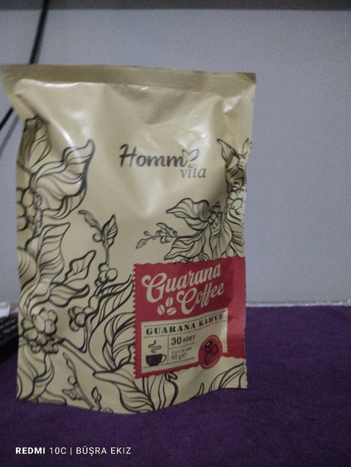 Homm Vita markasına ait 30 adet porsiyonluk guarana kahve tozu, bordo detaylı bej ambalajda, 60 gram ağırlığında. ☕️