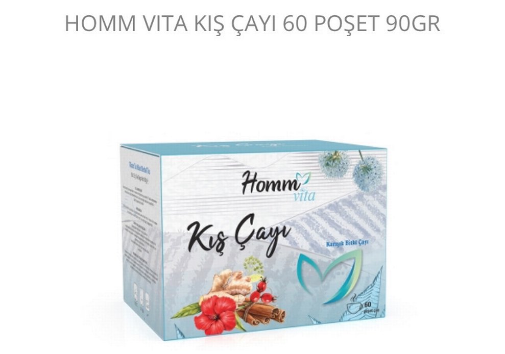 Homm Vita Kış Çayı, karışık bitkilerden oluşan rahatlatıcı bir çaydır. Kutuda 60 poşet bulunmaktadır. Ürün Açıklaması İçindekiler : Hatmi Çiçeği, Ihlamur, Kuşburnu, Hibiscus, Adaçayı, Mayıs Papatya, Ebegümeci, Zencefil, Tarçın, Havlıcan