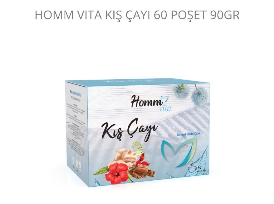 Homm Vita Kış Çayı 60 poşet bitki karışımı içerir. Zencefil, tarçın ve hibiskus gibi bitkilerle soğuk aylarda destek sağlar.