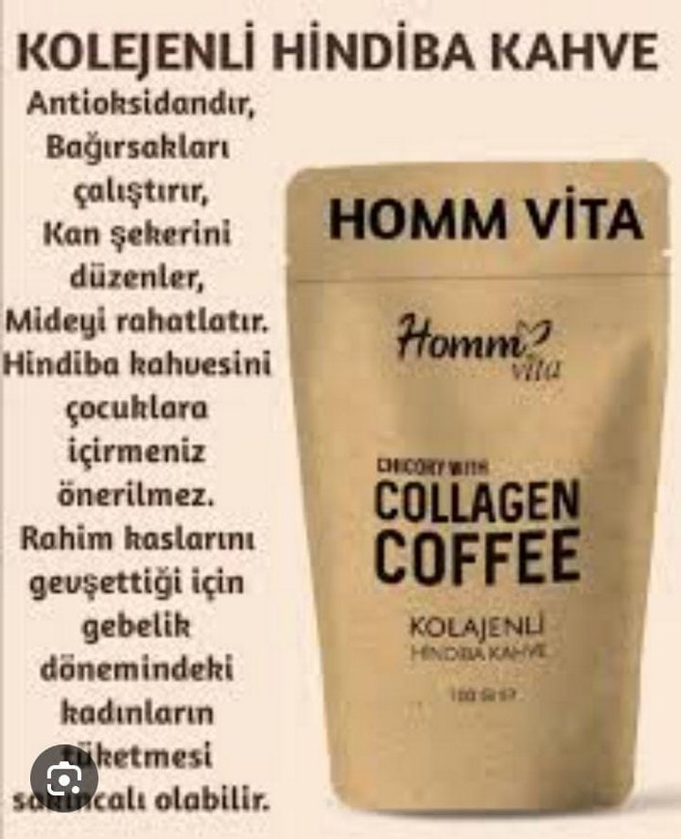 Homm Vita kolajenli hindiba kahvesi, bağırsağı çalıştırır, kan şekerini düzenler ve antioksidandır. Çocuklar ve gebelik dönemindeki kadınlar için önerilmez. ☕