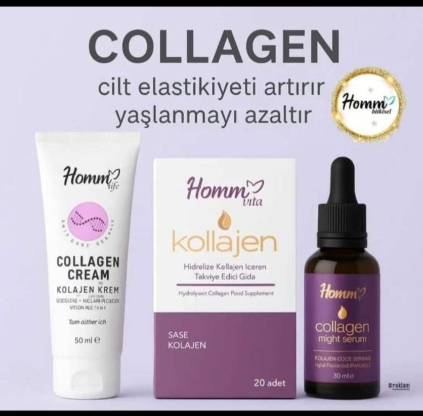 Homm Vita kollajen krem, serum ve 20 adet sachetten oluşan set cilt elastikiyetini artırır, yaşlanmayı azaltır. Hidrolize kollajen içerir.