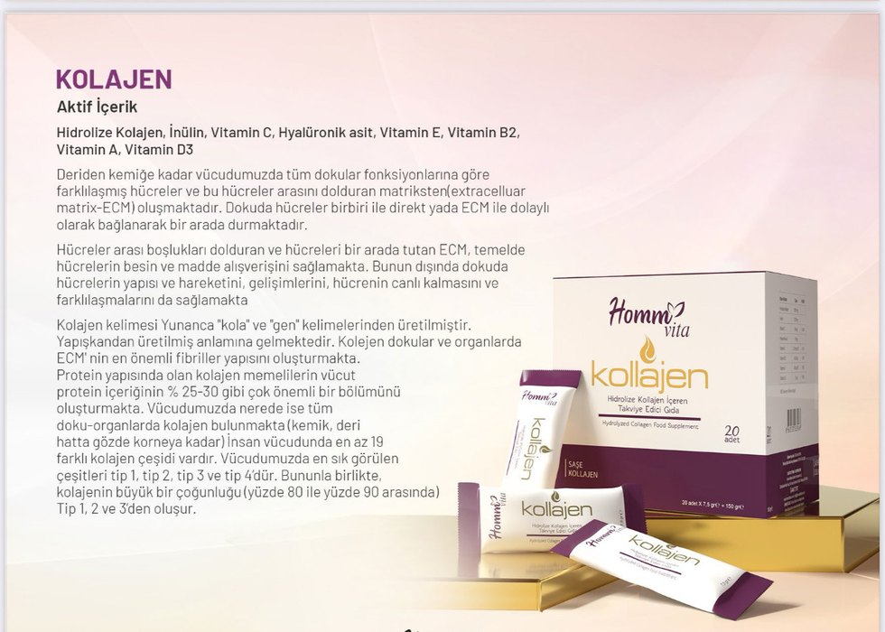 Homm kollajen , C vitamini, hyaluronik asit, E vitamini ve B2 vitamini ile dokuların sağlığını destekler, hücre fonksiyonlarını ve cilt canlılığını artırır. Sorularınız için dm