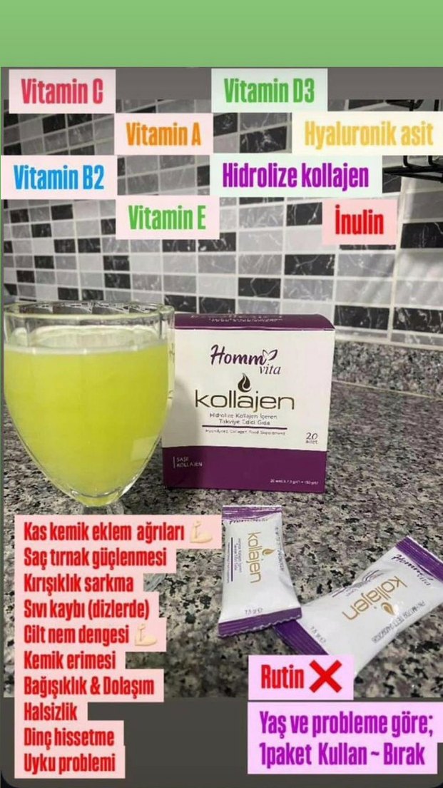 Homm Vita kollajen tozu, hyaluronik asit, vitamin A, B2, C, E, hidrolize kollajen ve inülin içerir. Cilt nem dengesi sağlar, saç ve tırnakları güçlendirir, eklem ve kemik sağlığını destekler, bağışıklık ve dolaşımı artırır.