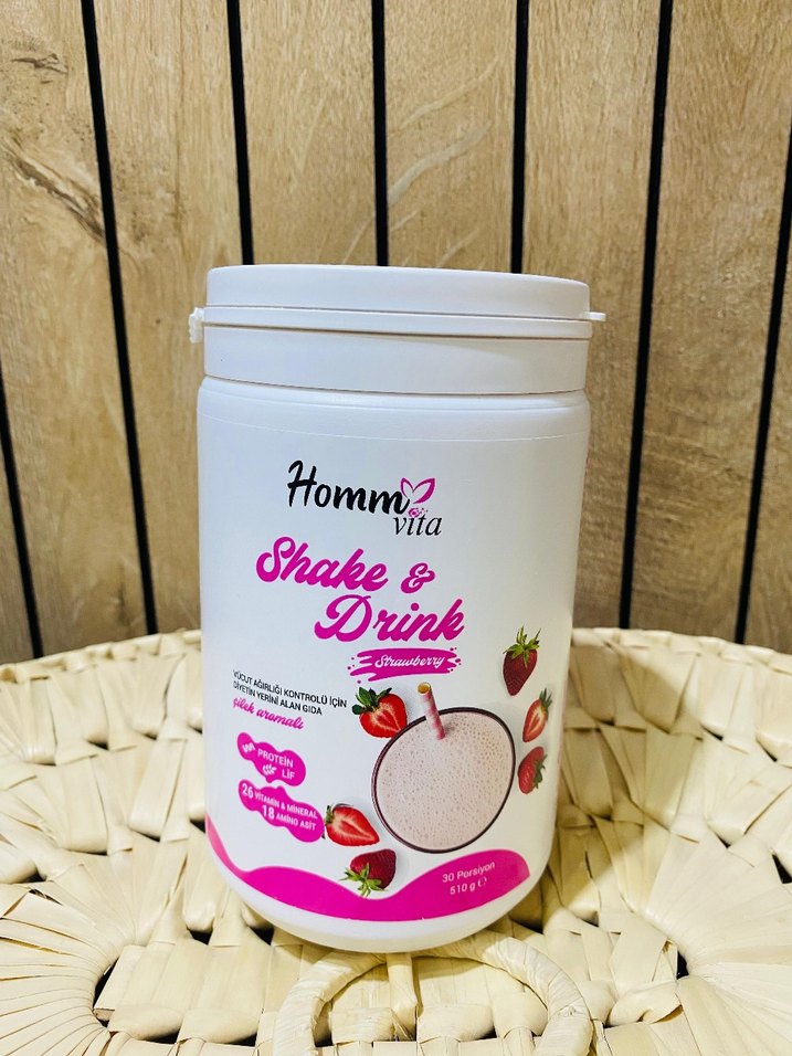 Homm Vita Shake & Drink, çilek aromalı toz karışımdır. Hızlı içecek hazırlamak için uygun, pastel pembe renklidir.
