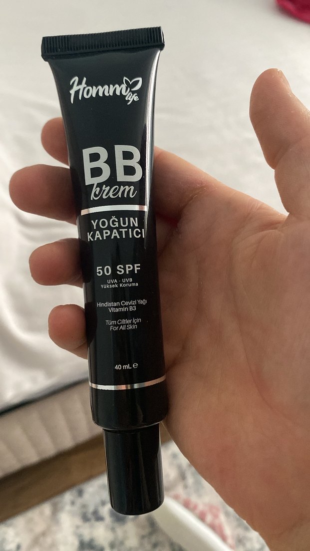 Homm BB krem, 50 SPF koruma ile yoğun kapatıcılık sağlar. Hindistan cevizi yağı ve B3 vitamini içerir, tüm cilt tiplerine uygundur. Parlak siyah ambalajda sunulur.