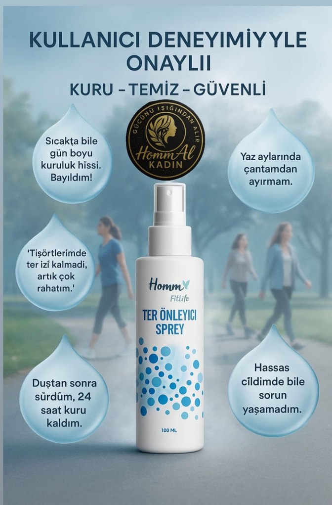 HommAl kadın ter önleyici sprey, hassas ciltler için uygun olup 24 saate kadar kuruluk ve koruma sağlar. Yaz aylarında ter izlerini önler ve rahatlık sunar.