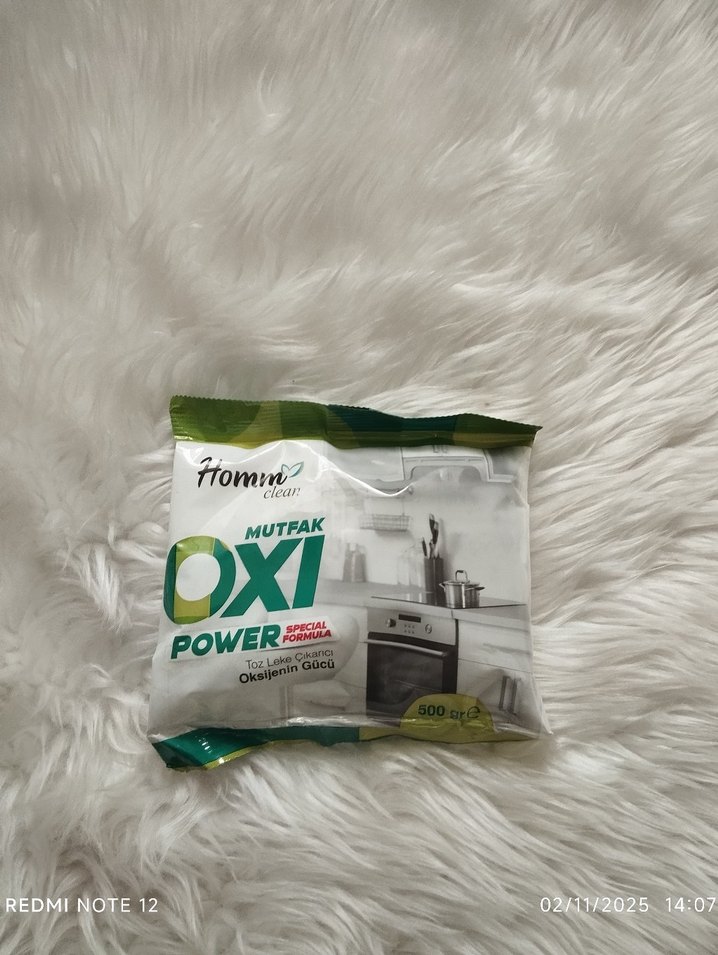 Homme Mutfak Oxi Power toz temizleyici, mutfak yüzeylerinde güçlü oksijenli temizlik sağlar. 500g ağırlığında, haki ve gri renkte paketlenmiştir.