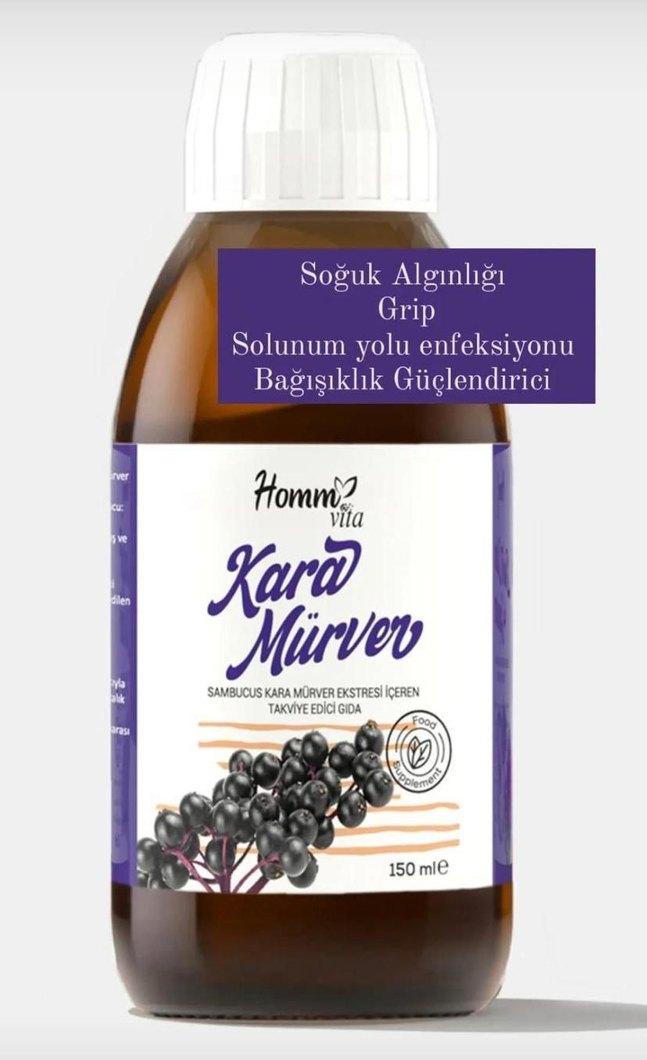 Homme Vita Kara Mürver ekstresi, soğuk algınlığı, grip ve solunum yolu enfeksiyonlarına karşı bağışıklığı güçlendirmeye yardımcı olur. 150 ml şişe.