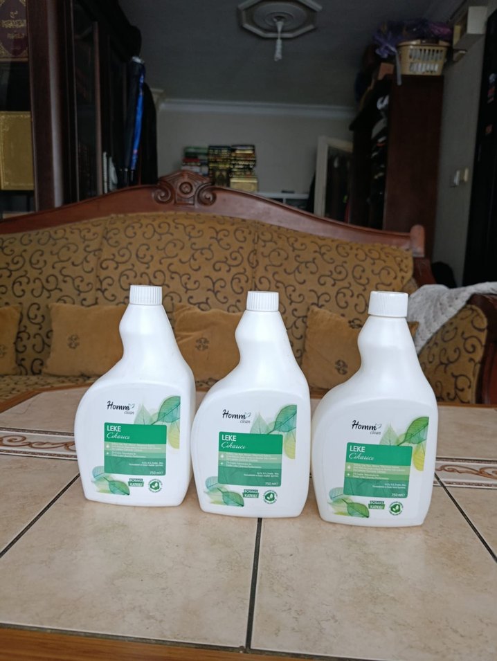 Hommee leke temizleyici şampuan, her biri yeşil etiketli ve doğal yaprak tasarımlı üçlü set halinde. Etkili temizlik için uygundur.