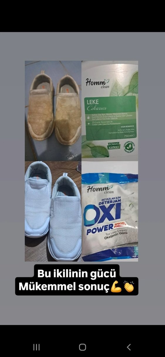Hommi Clean leke çıkarıcı ve Oxi Power deterjan, beyaz ayakkabıları etkili şekilde temizleyip lekeleri çıkarır, taze görünüm sağlar. temizlik seti leke çıkarıcı oxi ikili paket şokfiyatla satışta 475 tl