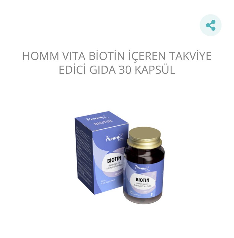 Hommi Vita Biotin içeren 30 kapsüllük takviye edici gıda. Saç ve tırnak sağlığını destekler.