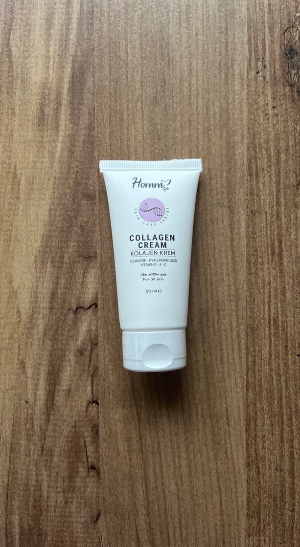 Hommie markasına ait kolajen, skualan, hyaluronik asit ve A-C vitamini içeren 50 ml kremi. Tüm cilt tipleri için nemlendirici ve elastikiyet destekleyici krem.
