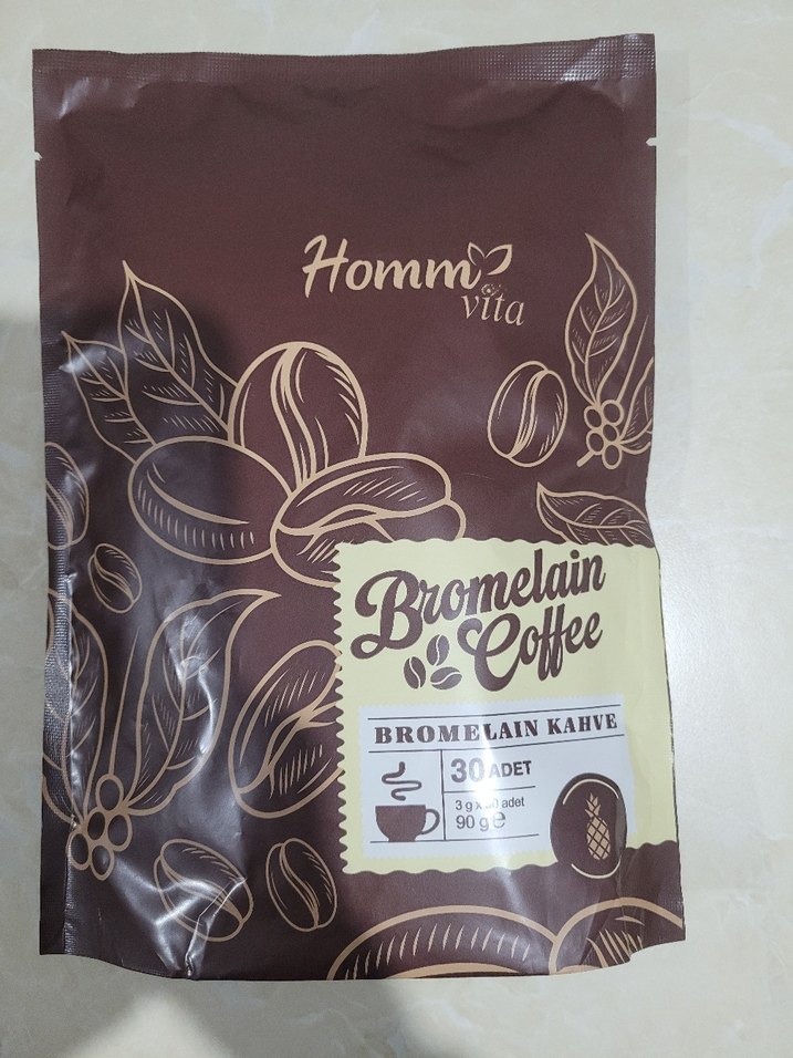 Hommo Vita Bromelain Kahve, 3 gramlık 30 adet paket halinde toplam 90 gram koyu kahverengi toz içerir. ☕