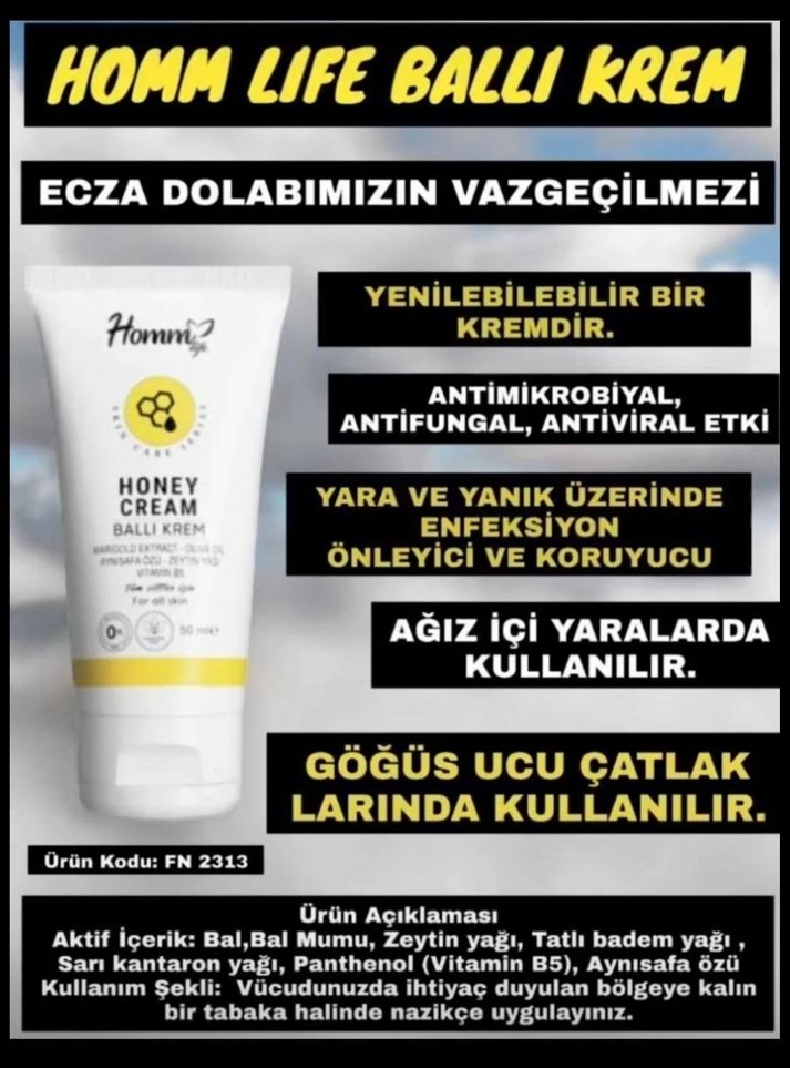 Hommy Ballı Krem, kadife çiçeği özü, zeytinyağı ve vitamin B5 içerir. Yara ve yanıklarda enfeksiyonu önler, hücre yenilenmesini destekler, yaranın hızlı kapanmasını sağlar. Açık yaralar, ağız içi, uçuk ve böcek sokmalarında kullanılabilir. Yenilebilir formda hazırlanmıştır.