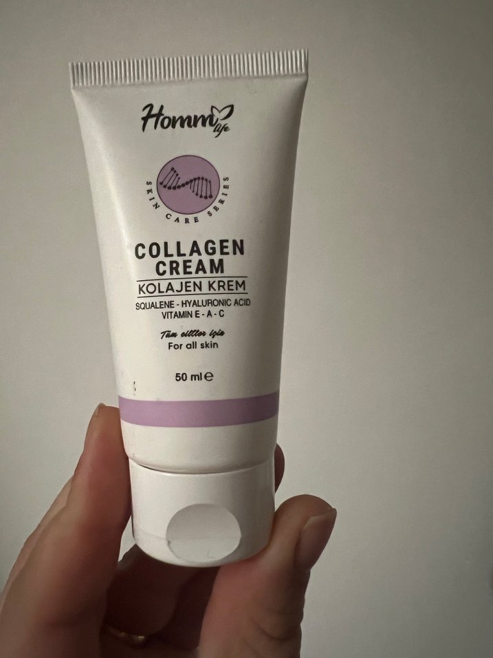 Hommy Collagen kolajen krem, squalene, hyaluronik asit ve A-C vitaminleri içerir, tüm cilt tipleri için nemlendirici ve besleyicidir.