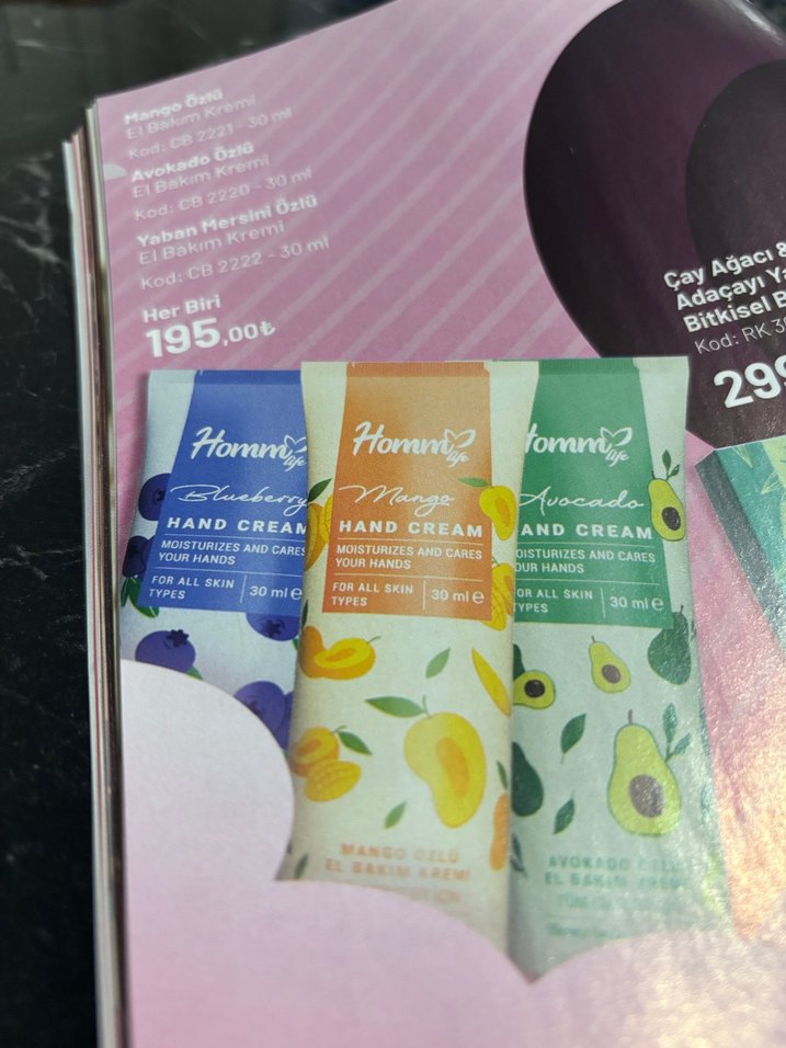 Hommy mango, avokado ve yaban mersini kokulu el bakım kremleri ellerinizi nemlendirir ve bakım yapar. Tüm cilt tiplerine uygundur, 30 ml.
