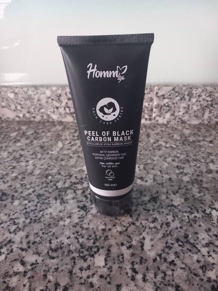 Hommy Life siyah karbonlu soyulabilir peeling maske, kömür, portakal özü ve kayısı çekirdeği yağı içerir. Tüm cilt tipleri için uygundur, 100 ml.