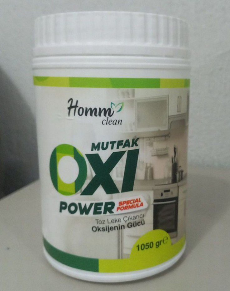 Hommy mutfak toz leke çıkarıcı, oksijen gücüyle etkili temizlik sağlar. 1050 gramlık parlak haki renkte kutuda.