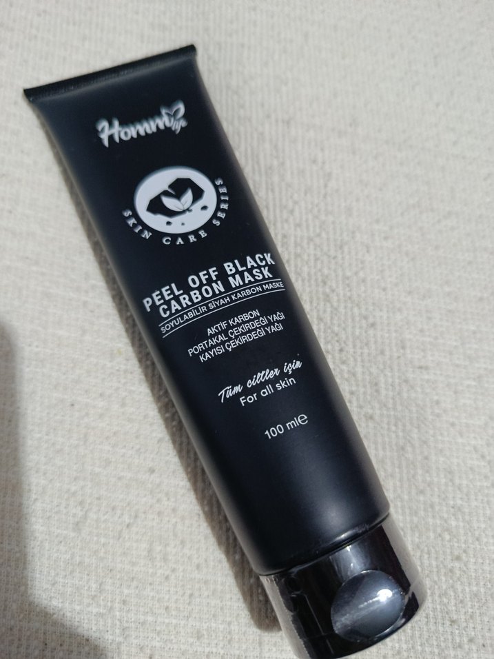 Hommy Siyah Karbon Peeling Maskesi, aktif karbon ve doğal özler içerir. Tüm cilt tipleri için uygundur, cildi temizler ve canlandırır. 100 ml tüpte.