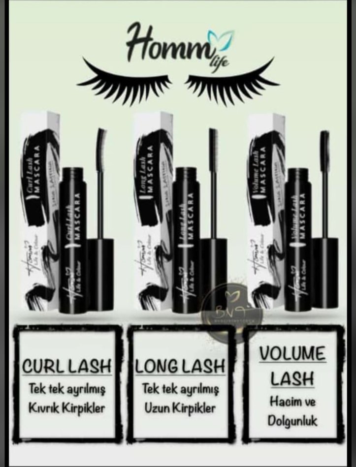 Hommy siyah maskara, tek tek ayrılmış, kıvrık, uzun ve hacimli kirpikler için Curl Lash, Long Lash ve Volume Lash seçenekleri sunar.