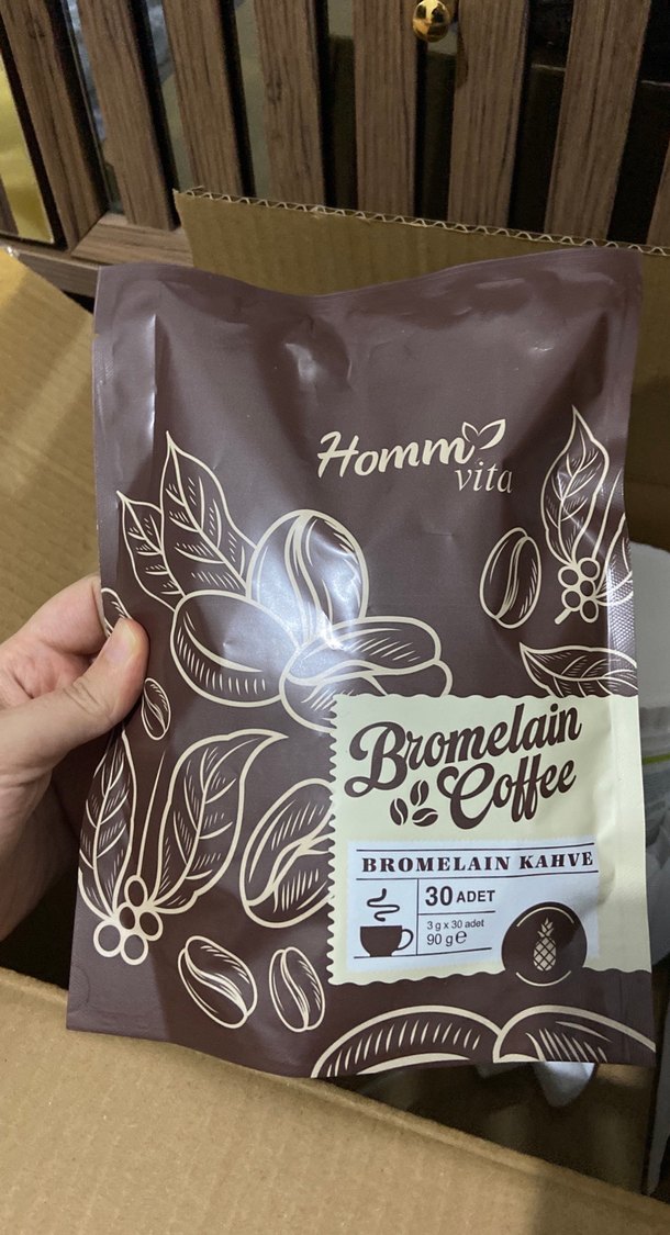 Hommy Vita Bromelain Kahve, 30 adet 90 gramlık paketlerde, koyu kahverengi rengindedir. ☕