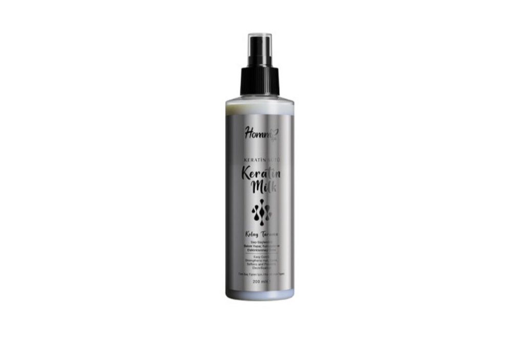 Homn Keratin Sütü, saçları yumuşatan ve besleyen keratin içeren saç bakım spreyi. Kolay şekillendirme ve parlaklık sağlar. 200 ml şişede.