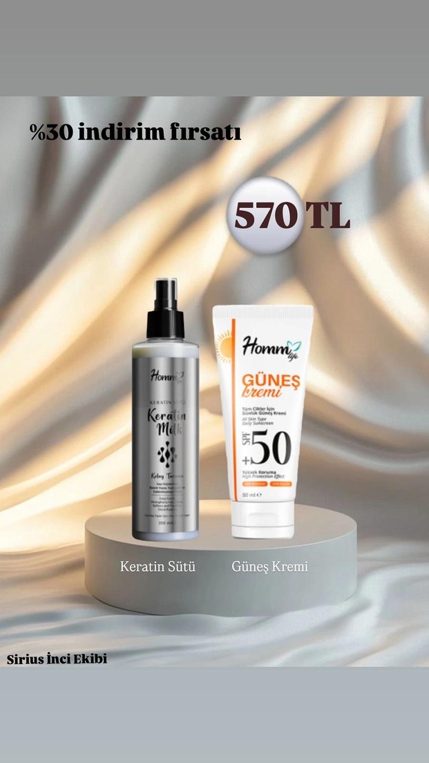 Homna Keratin Sütü ve SPF 50+ Güneş Kremi içeren set, %30 indirimle güneş koruması ve saç bakımı sağlar. Cilt ve saç için besleyici. ☀️