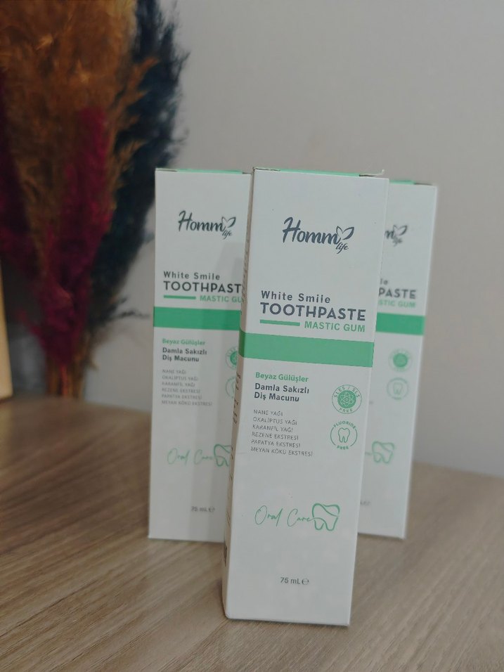 Homni White Smile diş macunu, sakız özü ile nazik ağız bakımı sağlar ve parlak bir gülümseme destekler. Dişlerin temiz ve ferah kalmasına yardımcı olur.