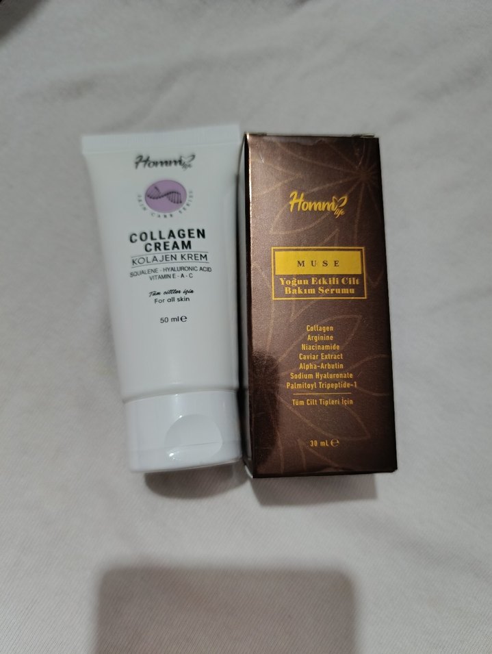 Homnie Muse el bakım seti, kolajen krem ve yoğun etkili bakım serumu içerir. Kolajen, niasinamid ve cilt besleyici maddelerle zenginleştirilmiştir. Tüm cilt tipleri için uygundur.